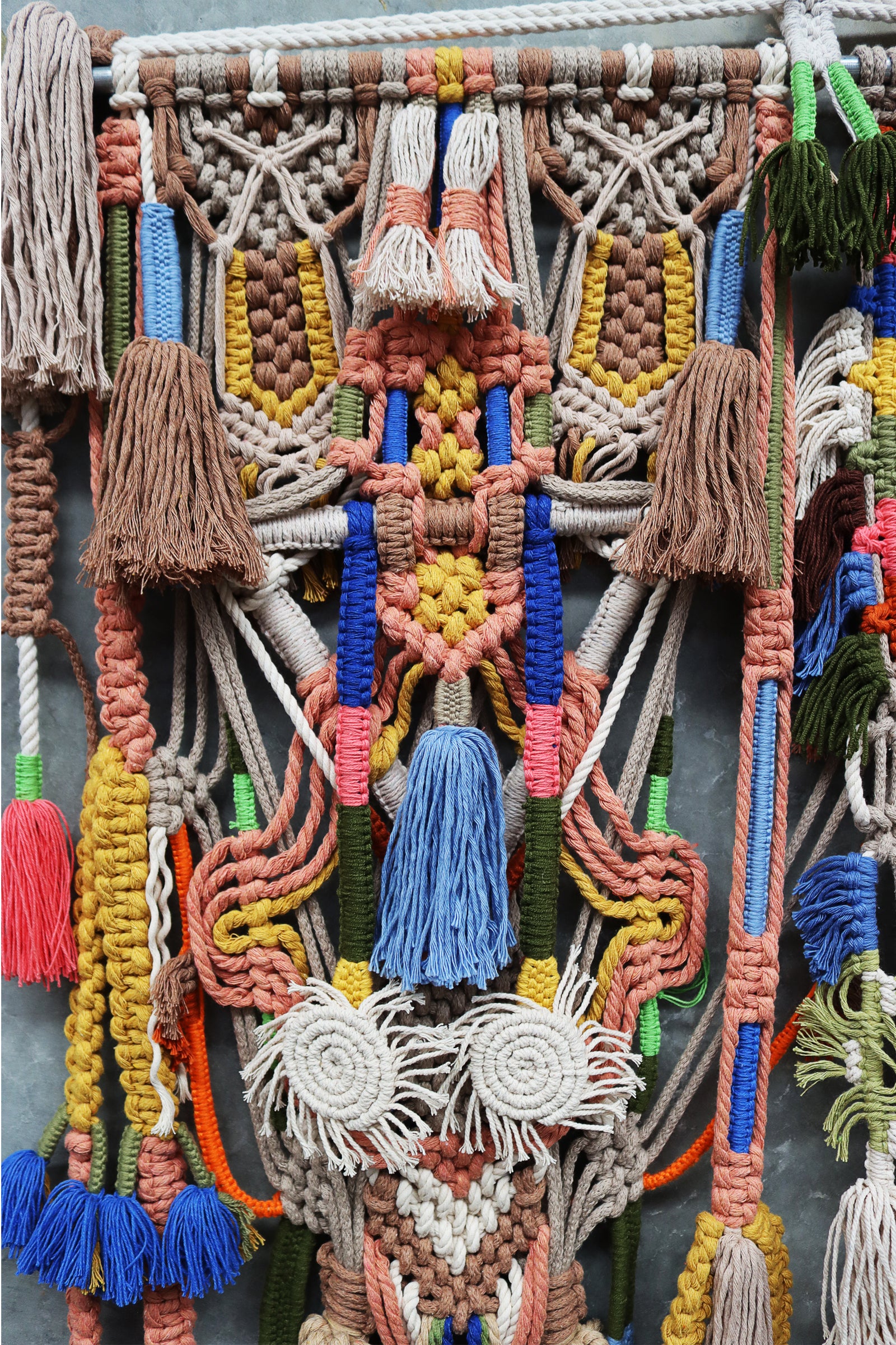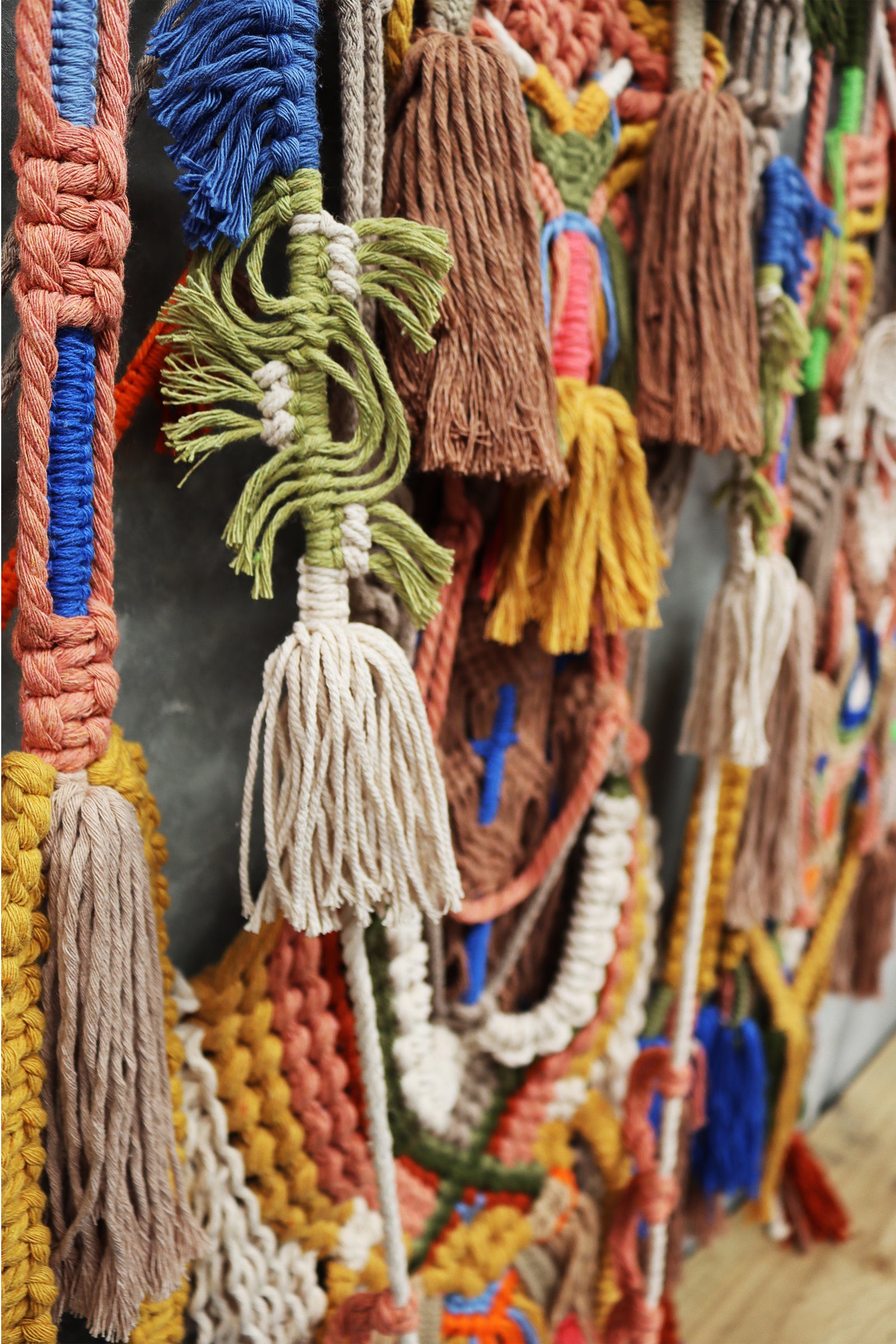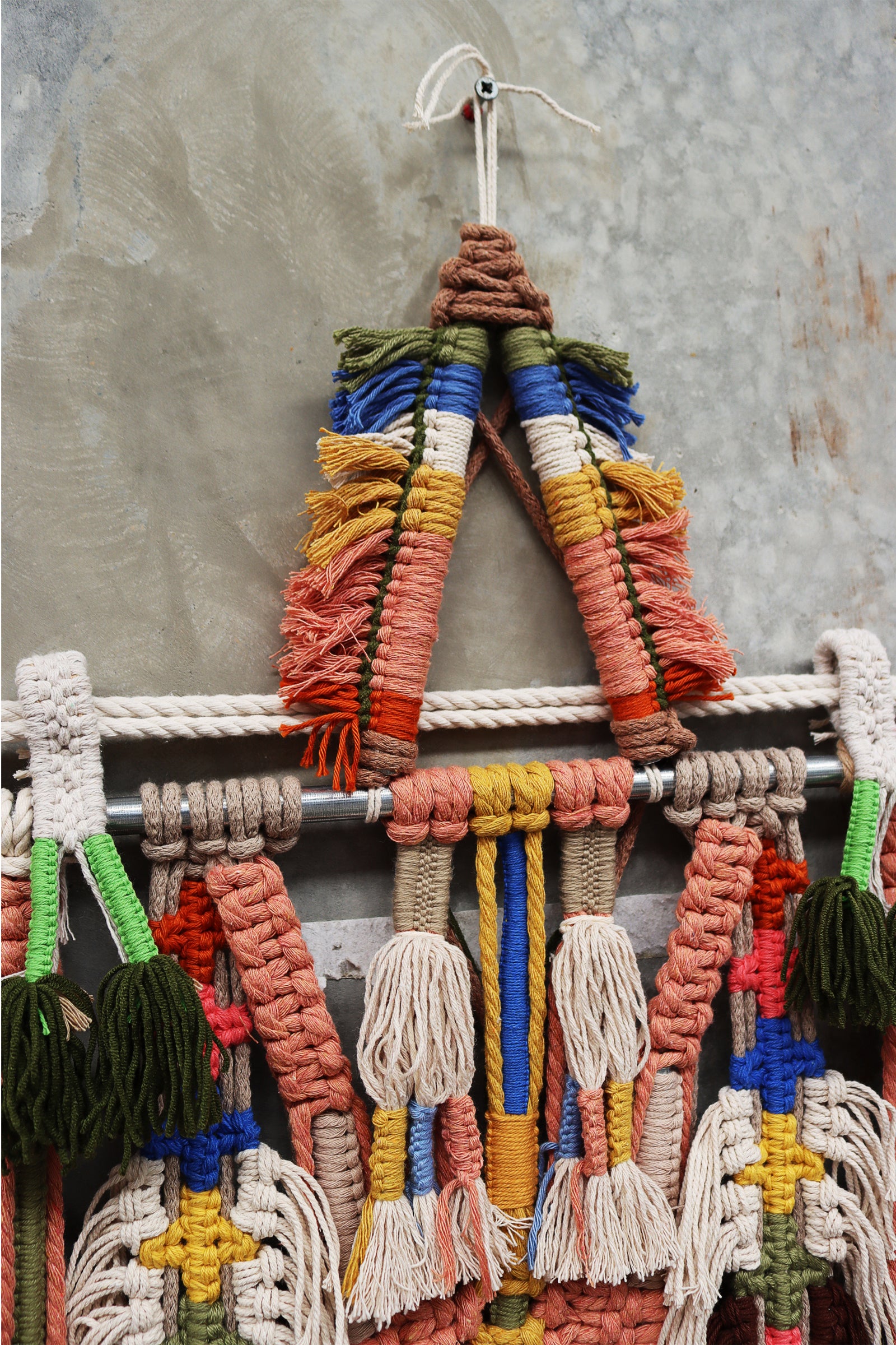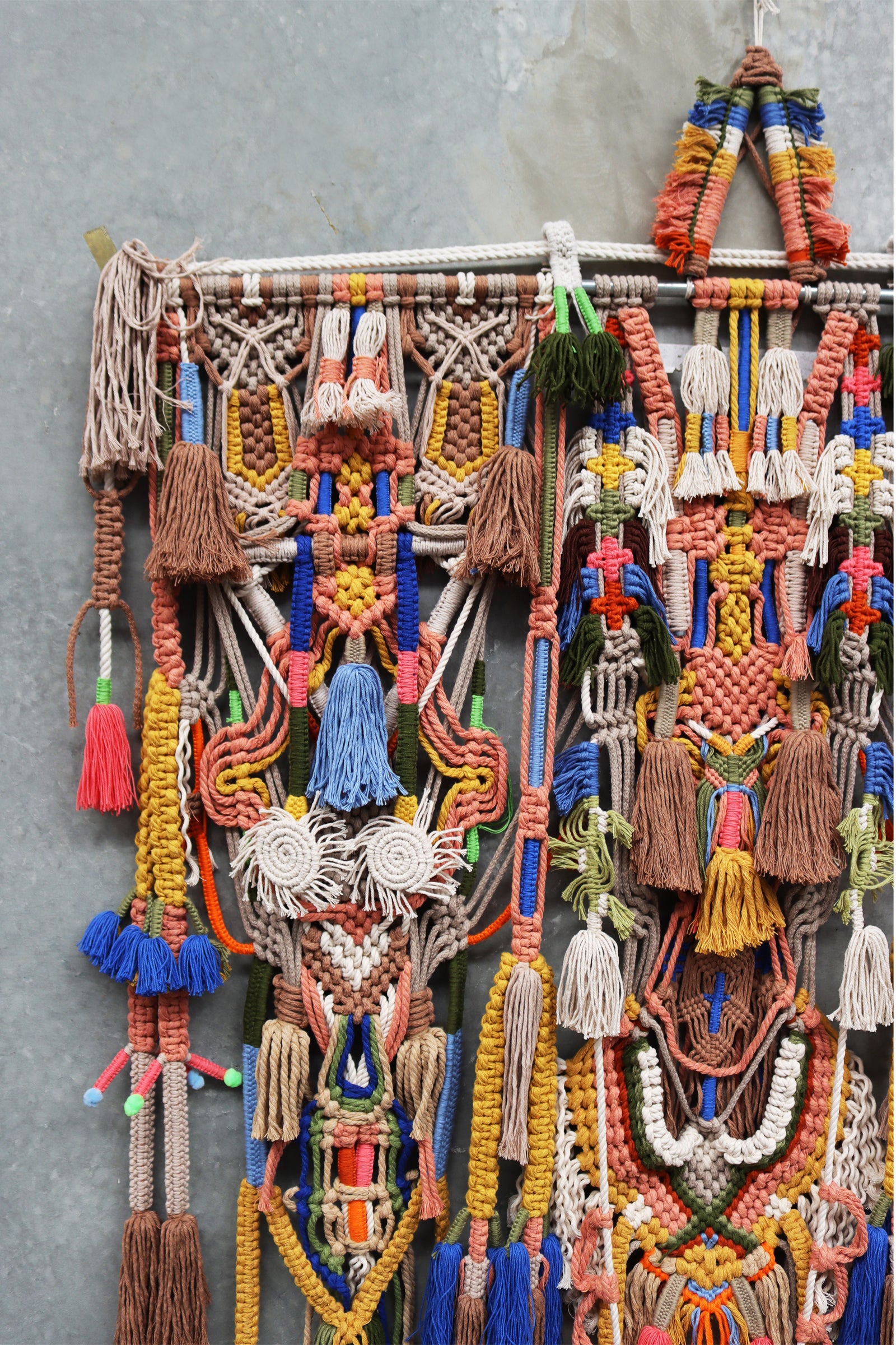 highly detailed macrame piece with tassels set on timber or aluminum rods.