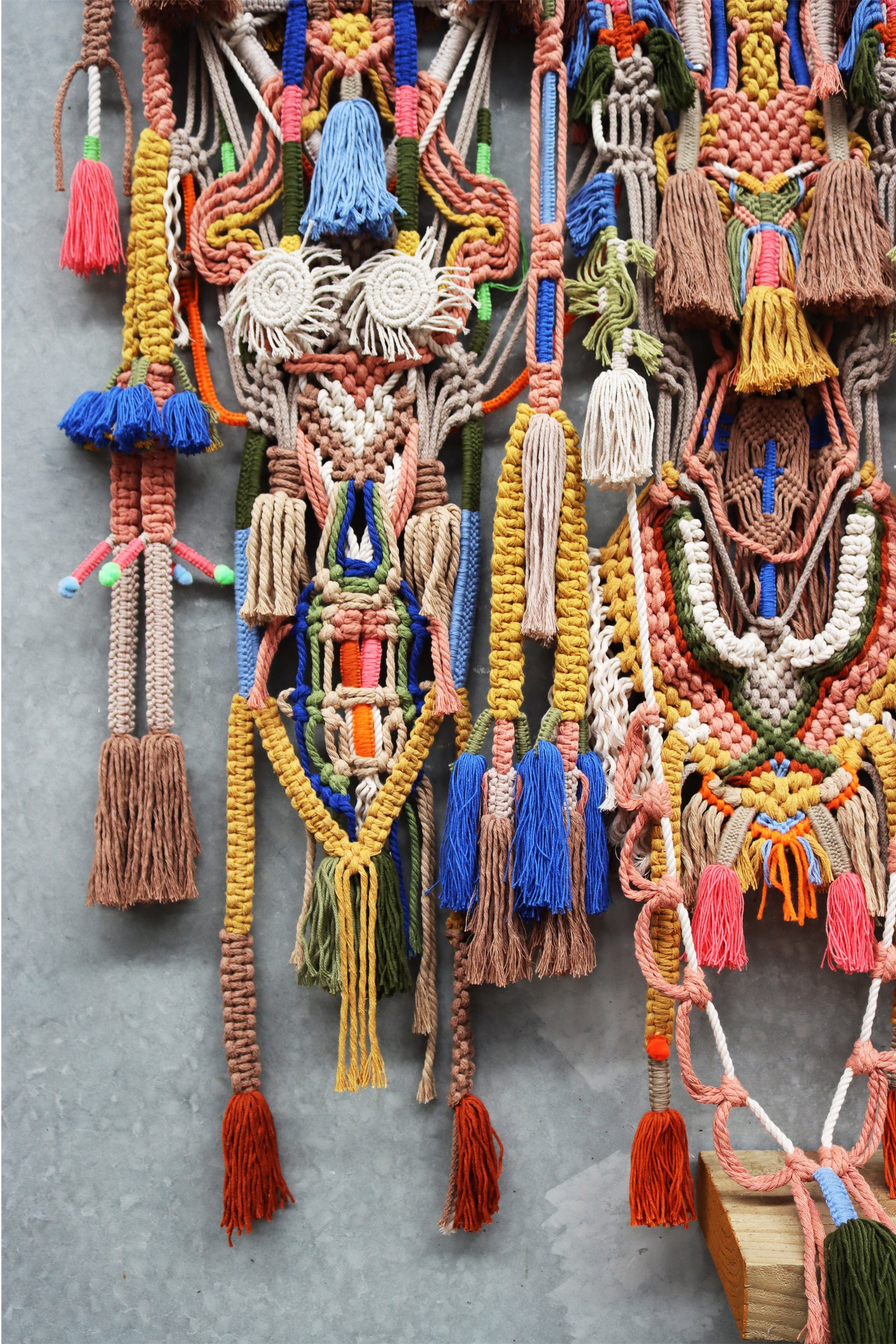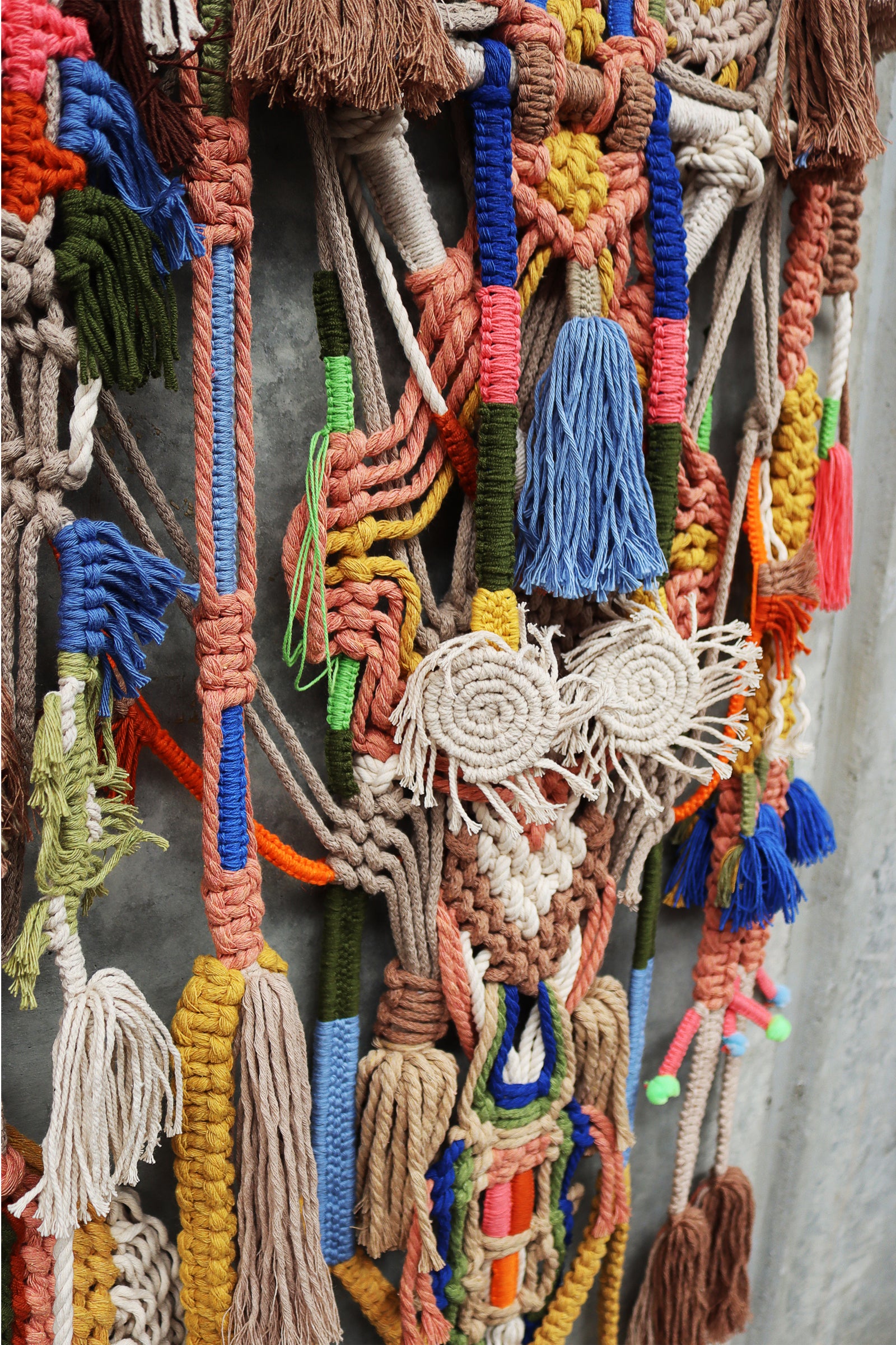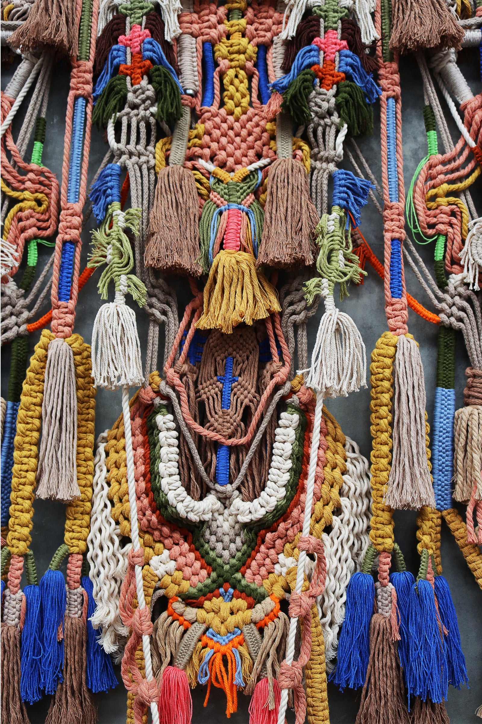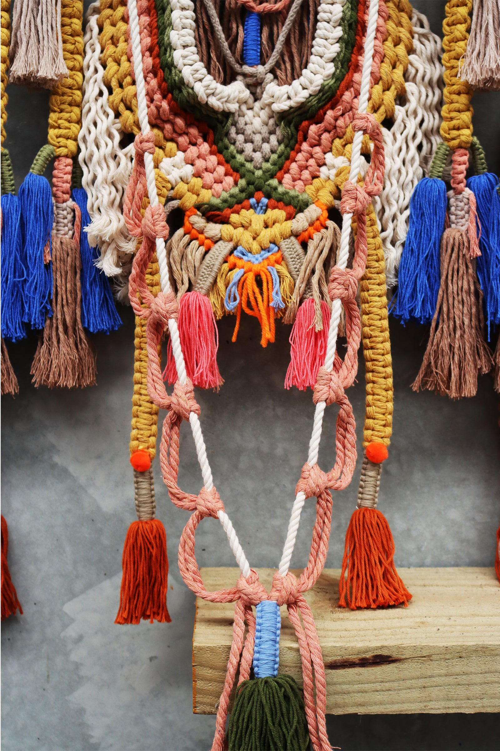 highly detailed macrame piece with tassels set on timber or aluminum rods.