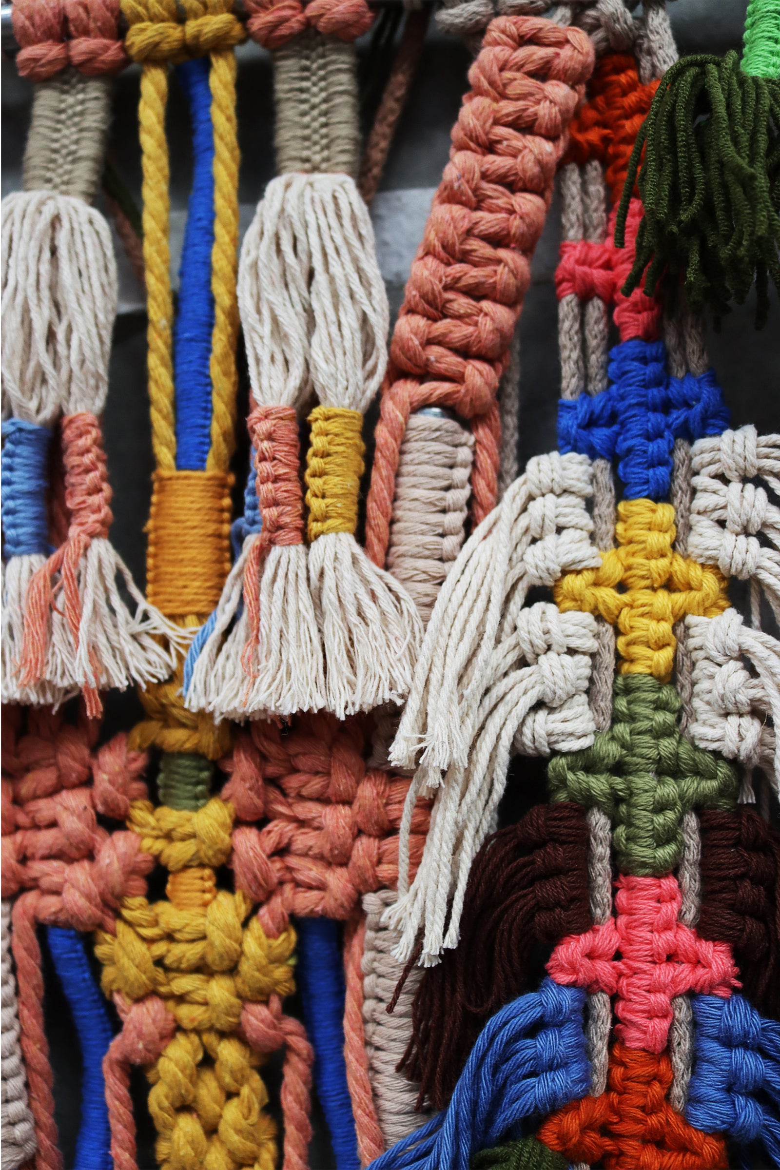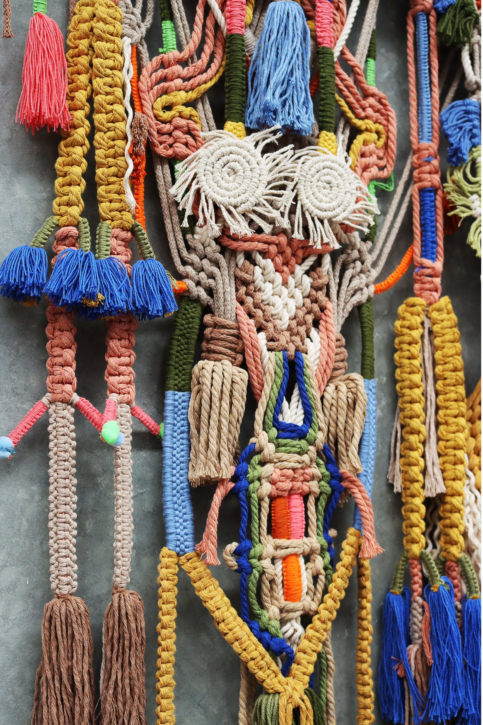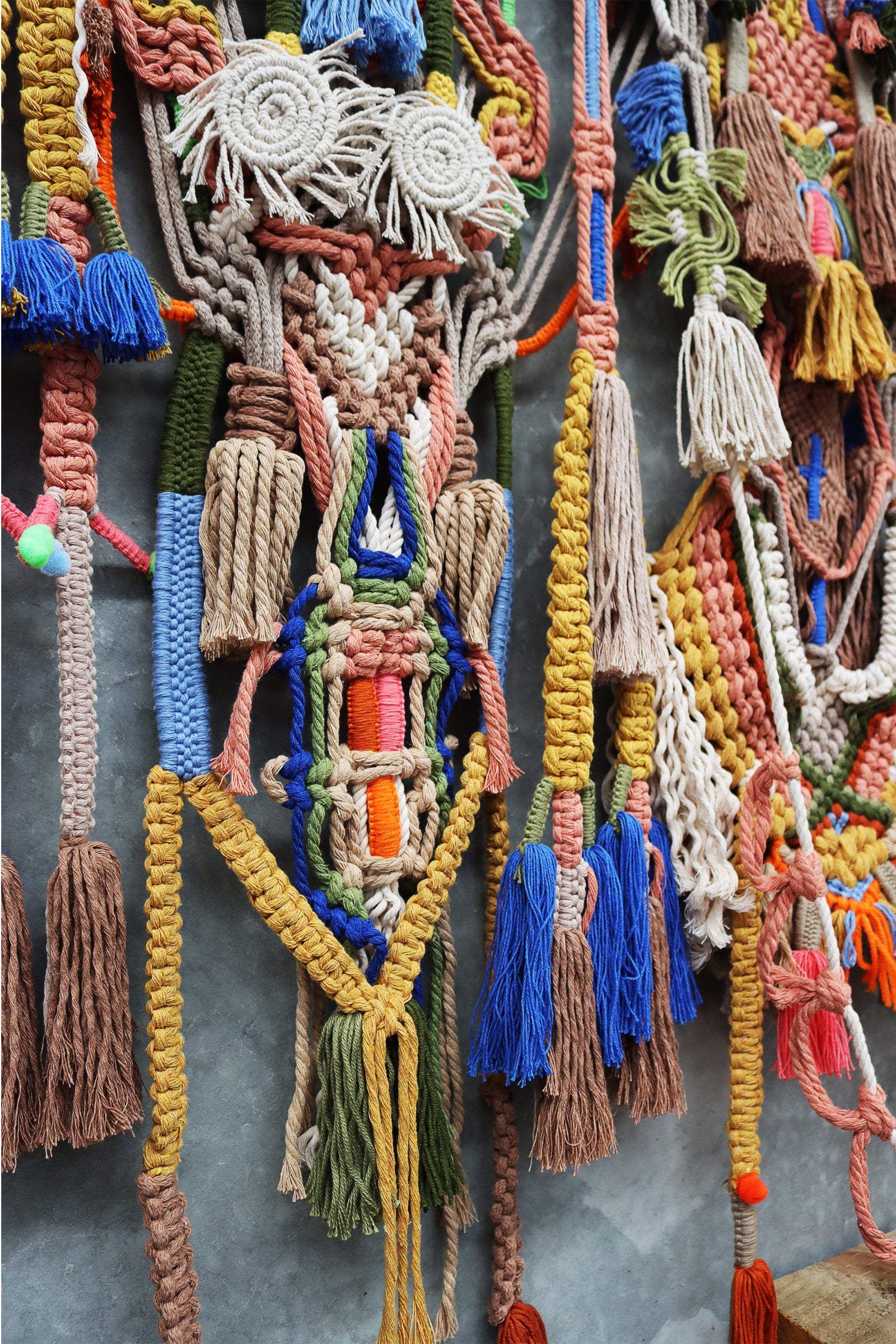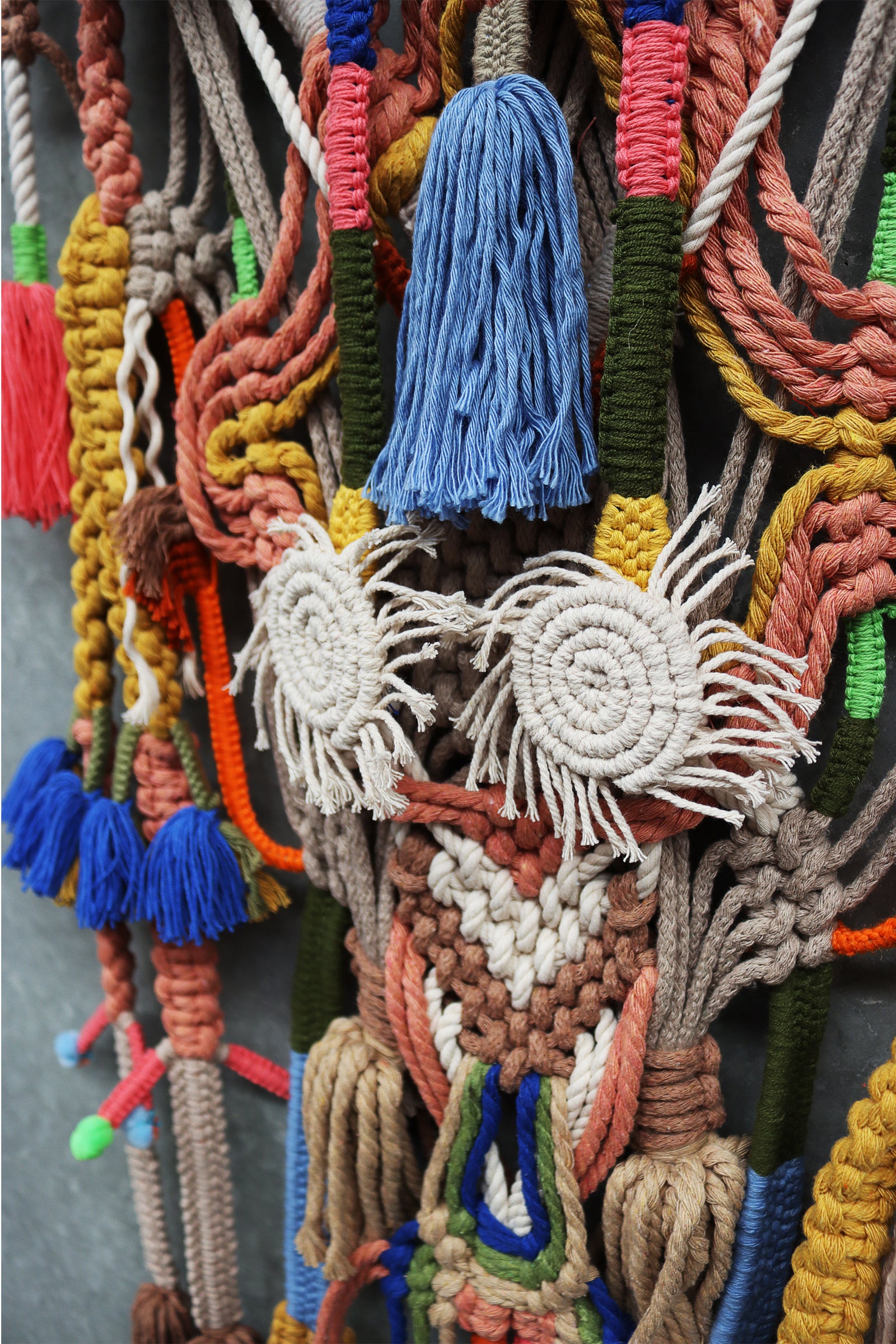 highly detailed macrame piece with tassels set on timber or aluminum rods.